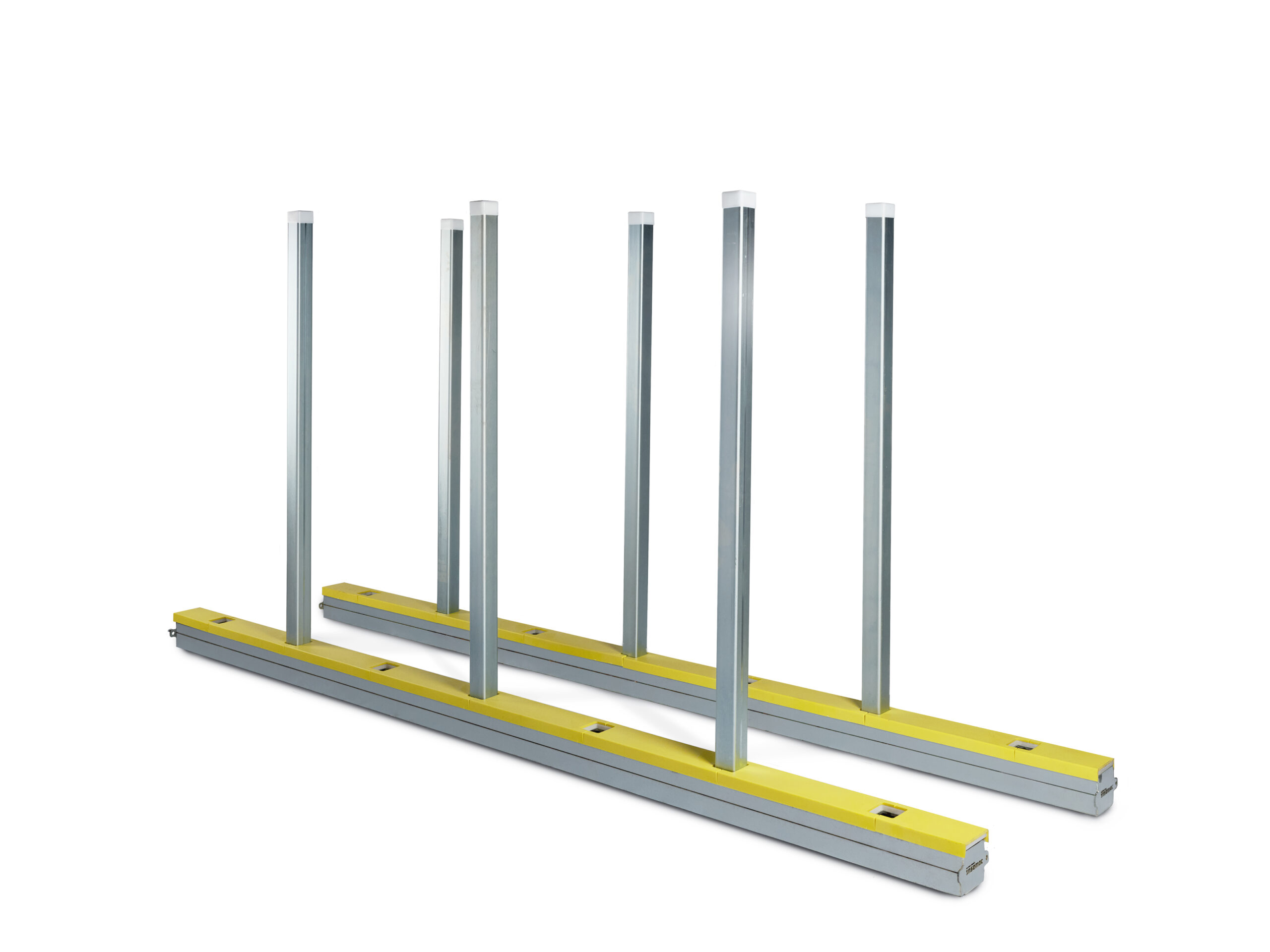 The system consists of two longitudinally welded UPN100 profiles. It features 7 dies for accommodating the baton (60x60x4mm tube), with the dies evenly distributed along the 3 meters. The distance between holes is 36.5 cm.